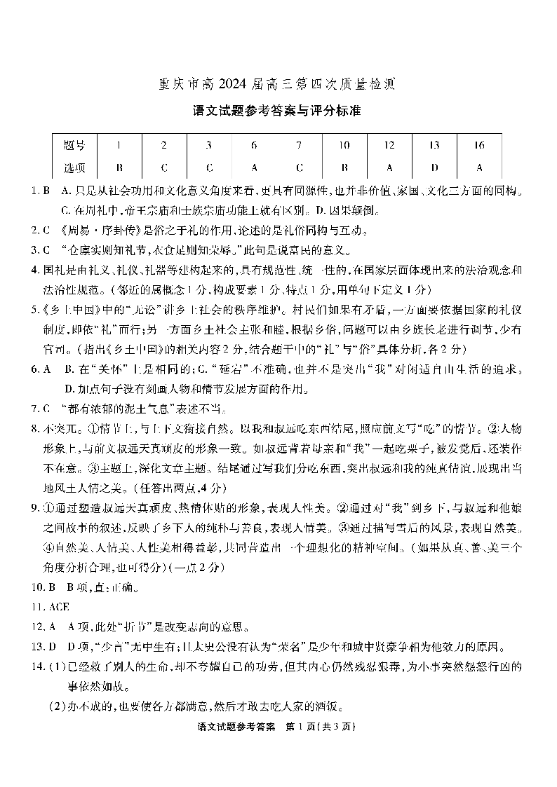 重庆市南开中学2024届高三第四次质量检测语文答案