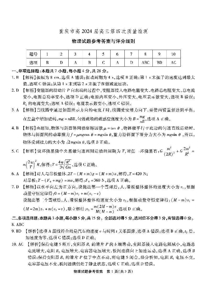 重庆市南开中学2024届高三第四次质量检测物理答案