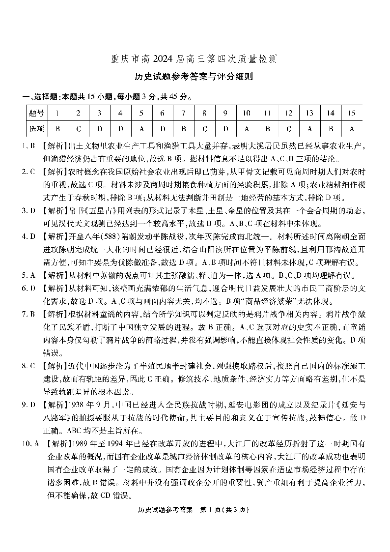 重庆市南开中学2024届高三第四次质量检测历史答案