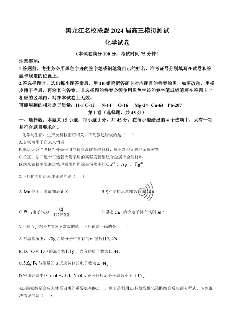 黑龙江名校联盟2024 届高三模拟测试化学+答案