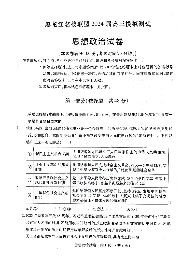黑龙江名校联盟2024 届高三模拟测试政治+答案