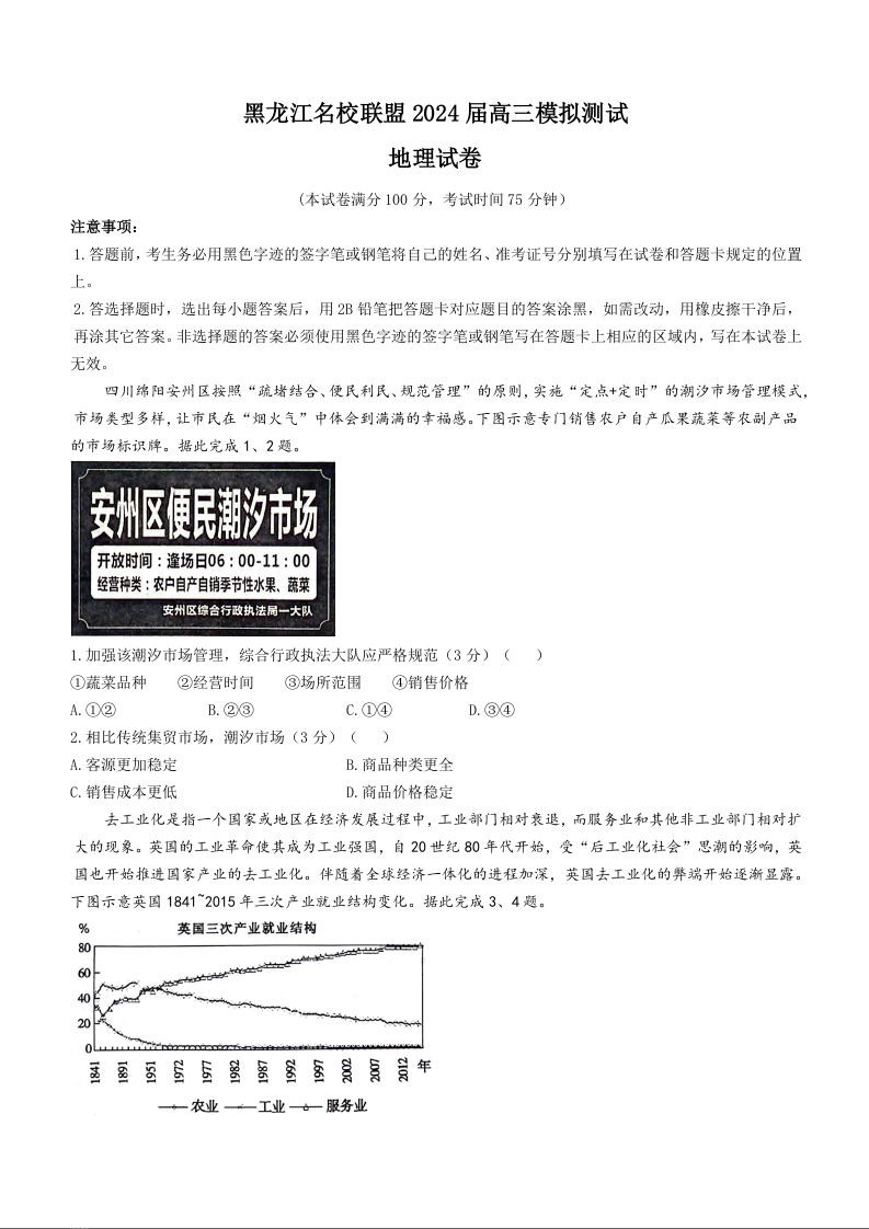 黑龙江名校联盟2024 届高三模拟测试地理+答案