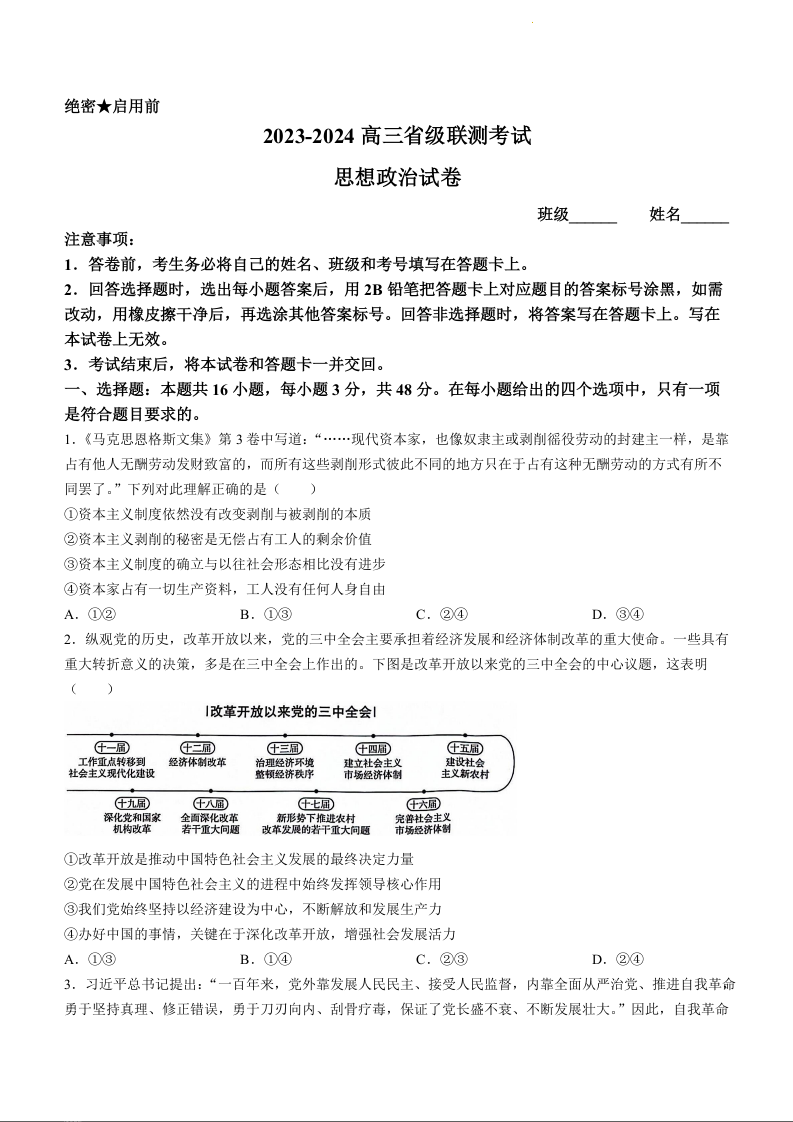 河北省省级联测考试2024届高三上学期12月月考政治+答案