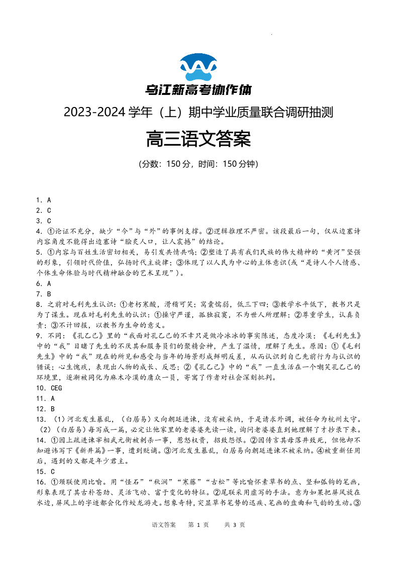 重庆市乌江新高考协作体2024届高三期中学业质量联合调研抽测语文答案