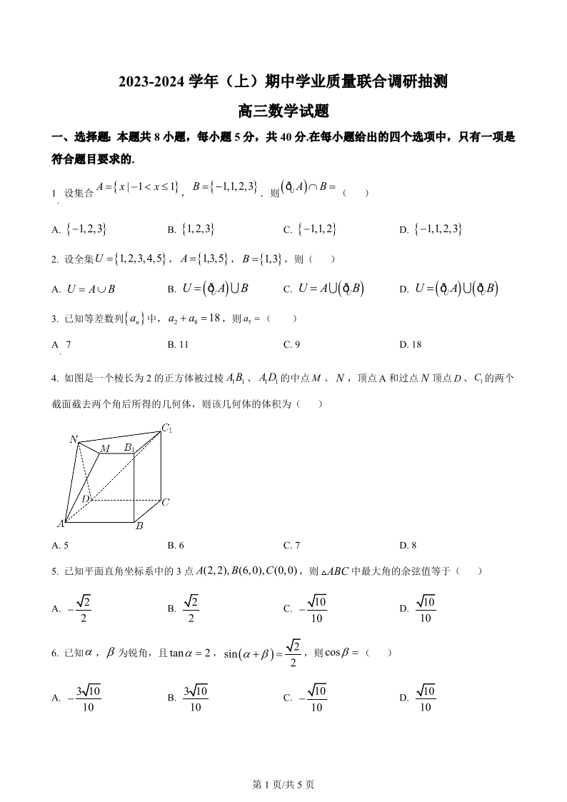 重庆市乌江新高考协作体2024届高三期中学业质量联合调研抽测数学