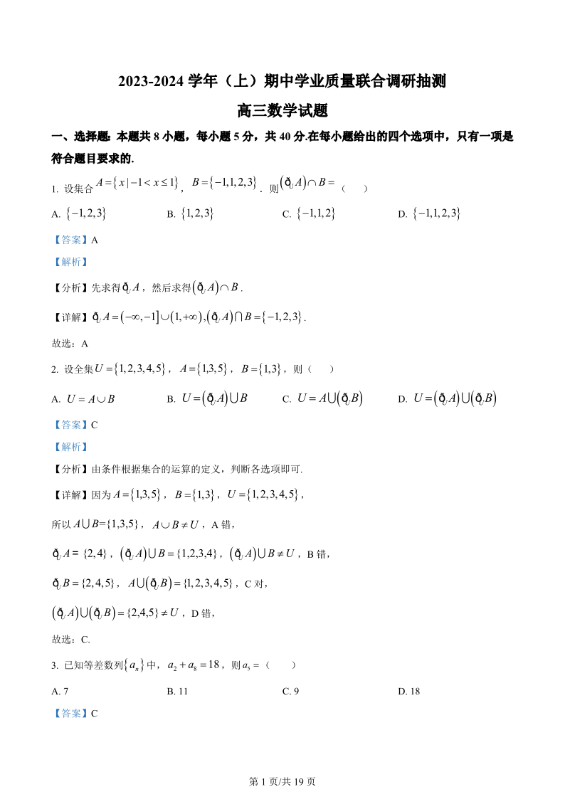 重庆市乌江新高考协作体2024届高三期中学业质量联合调研抽测数学答案