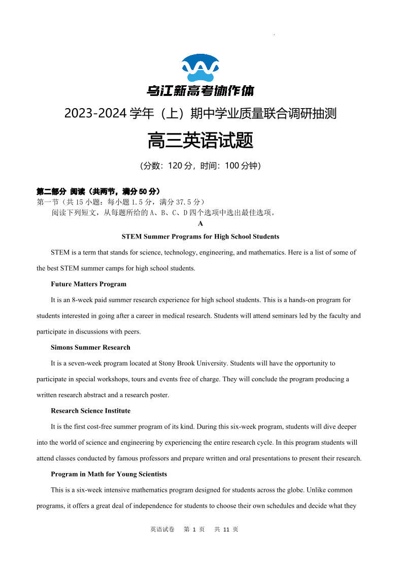重庆市乌江新高考协作体2024届高三期中学业质量联合调研抽测英语