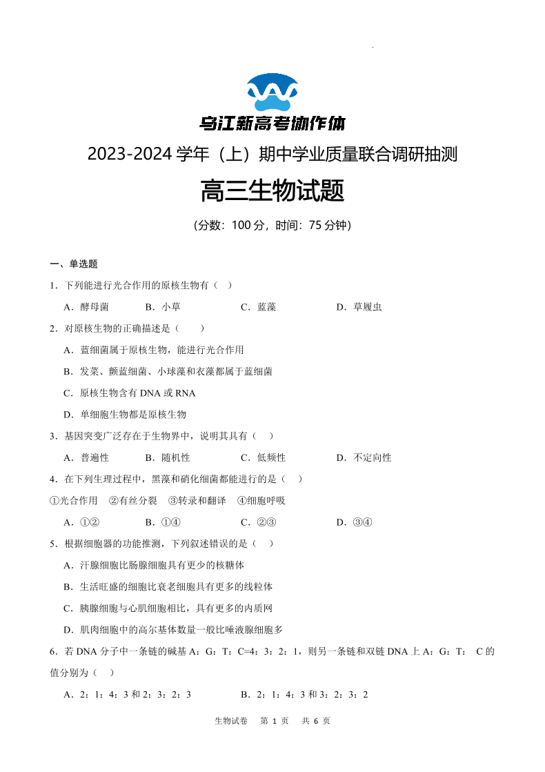 重庆市乌江新高考协作体2024届高三期中学业质量联合调研抽测生物