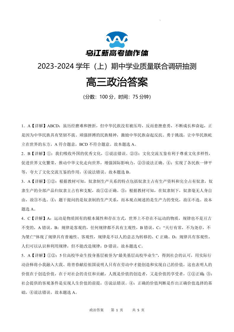 重庆市乌江新高考协作体2024届高三期中学业质量联合调研抽测政治答案