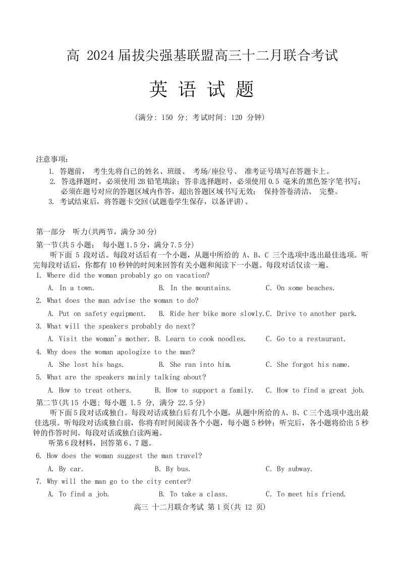 重庆市西南大学附中重庆育才中学2024届高三上学期12月月考英语+答案