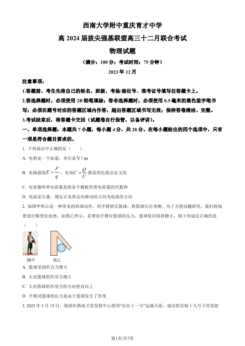 重庆市西南大学附中重庆育才中学2024届高三上学期12月月考物理(原卷版)