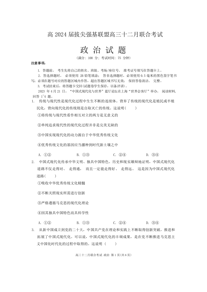 重庆市西南大学附中重庆育才中学2024届高三上学期12月月考政治+答案