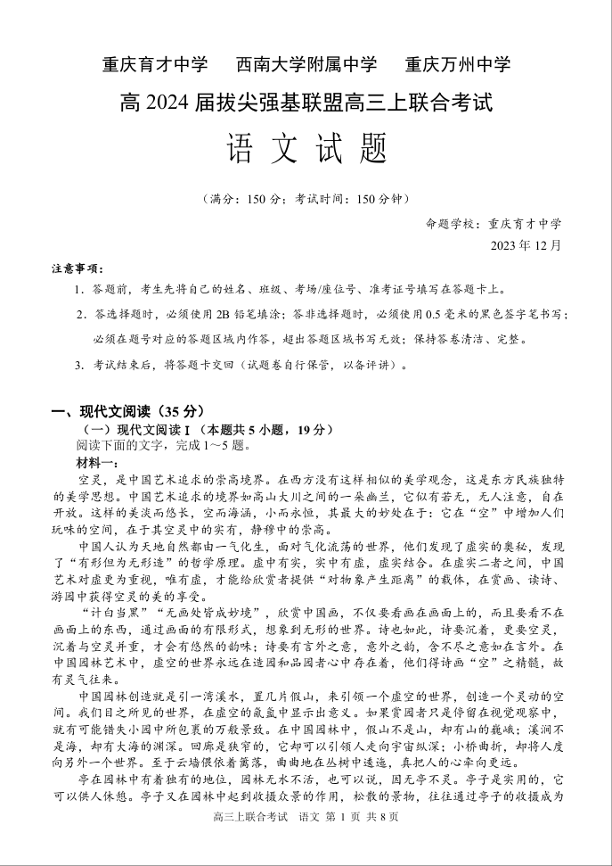 重庆市育才中学、万州高级中学、西南大学附属中学2024届高三12月联考语文