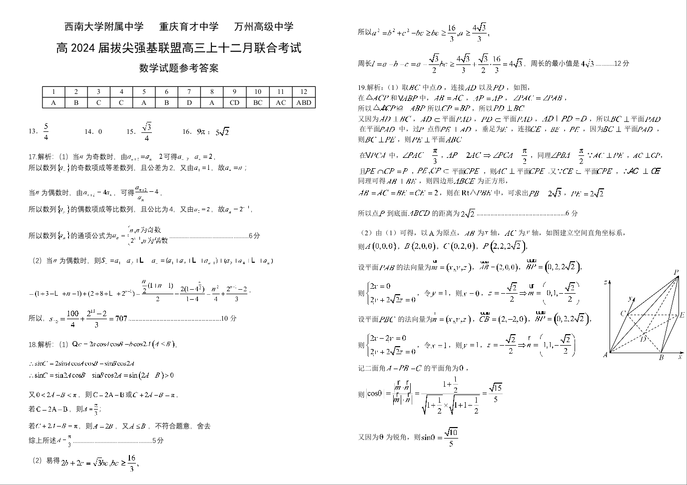 重庆市育才中学、万州高级中学、西南大学附属中学2024届高三12月联考数学答案