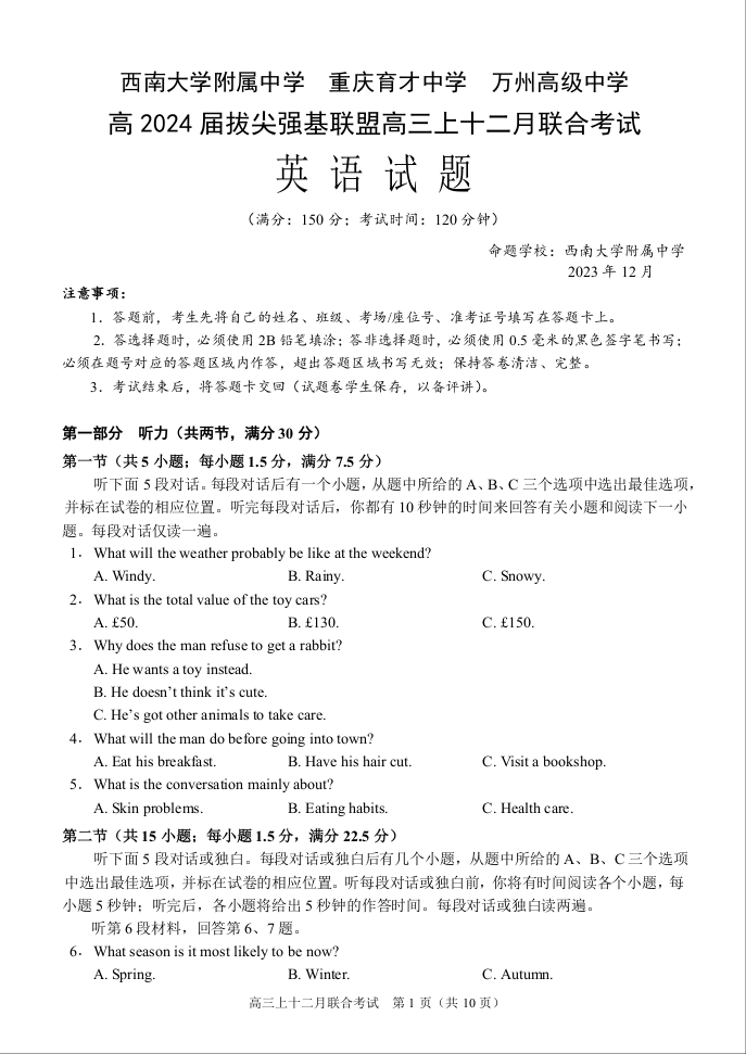 重庆市育才中学、万州高级中学、西南大学附属中学2024届高三12月联考英语