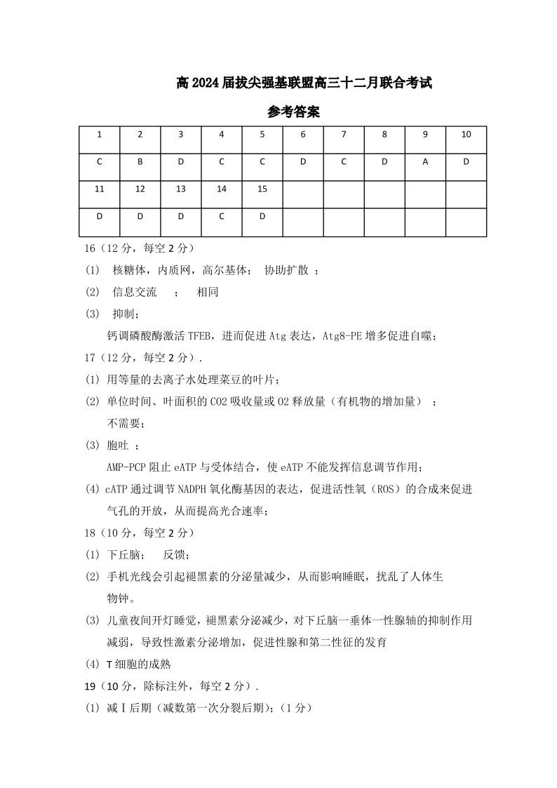 重庆市育才中学、万州高级中学、西南大学附属中学2024届高三12月联考生物答案