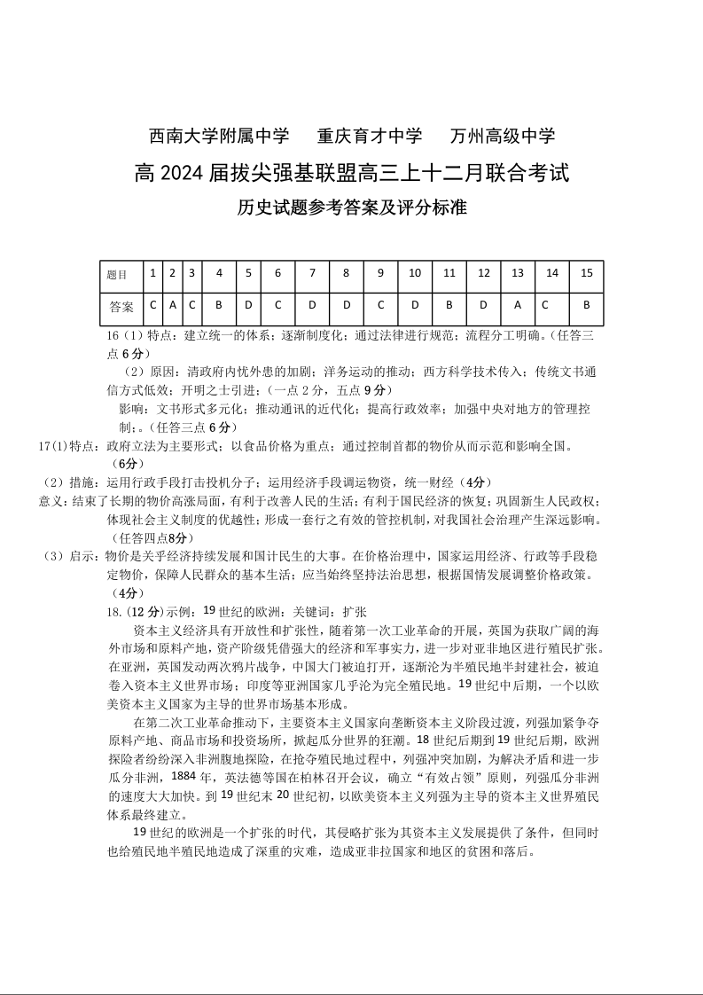 重庆市育才中学、万州高级中学、西南大学附属中学2024届高三12月联考历史答案