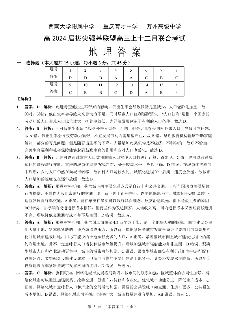 重庆市育才中学、万州高级中学、西南大学附属中学2024届高三12月联考地理答案