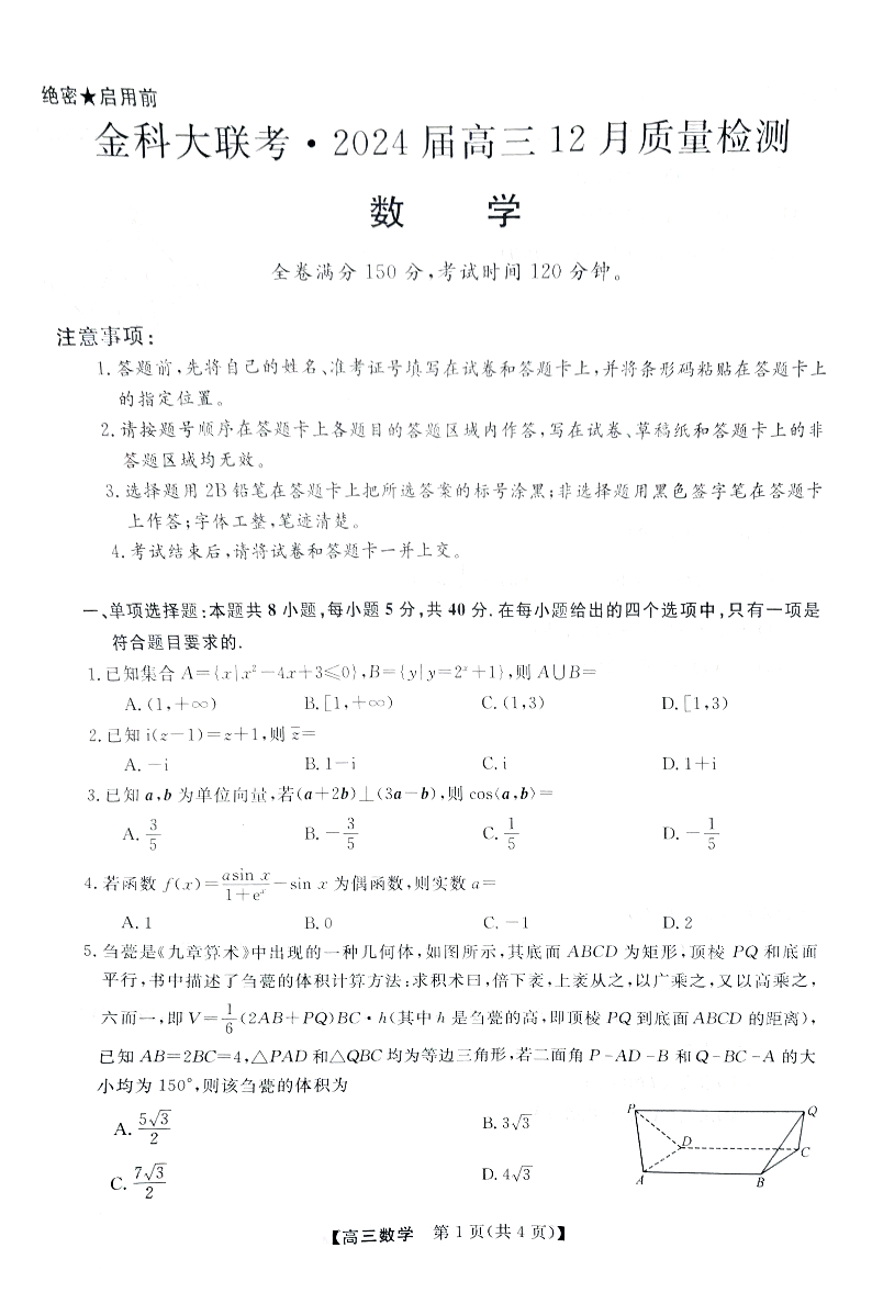 河北省金科大联考2024届高三上学期12月质量检测数学