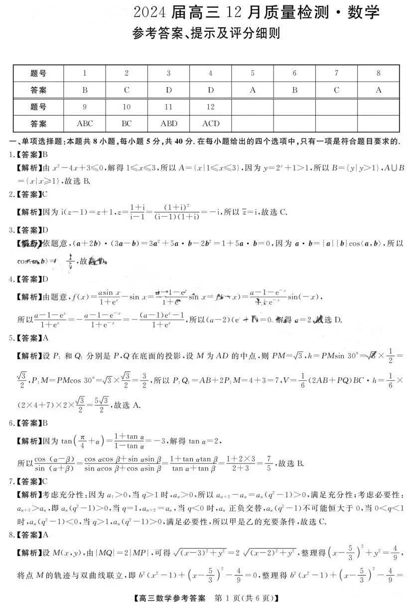 河北省金科大联考2024届高三上学期12月质量检测数学答案