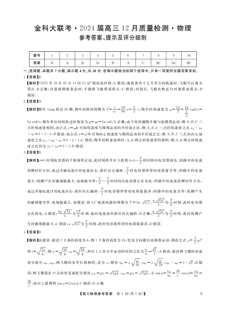 河北省金科大联考2024届高三上学期12月质量检测物理答案
