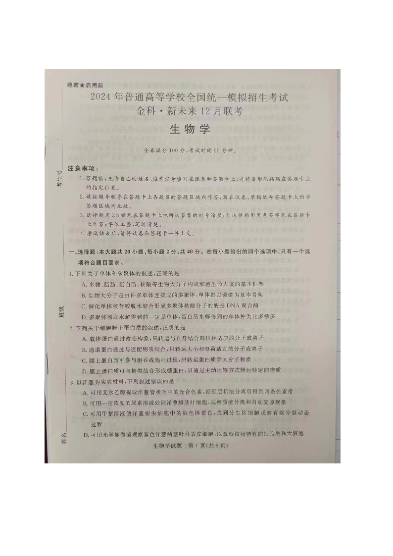 河北省金科大联考2024届高三上学期12月质量检测生物