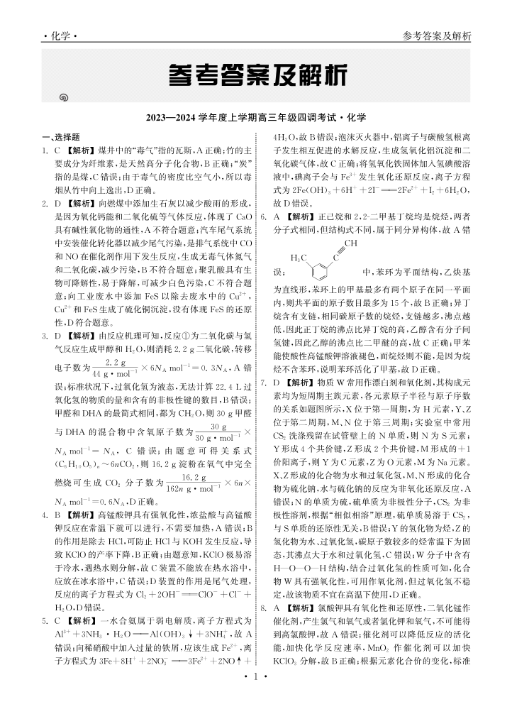 河北省衡水中学2024届高三上学期四调考试化学答案