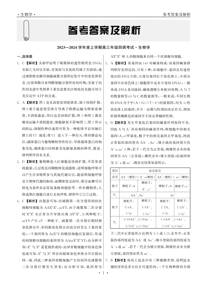 河北省衡水中学2024届高三上学期四调考试生物答案
