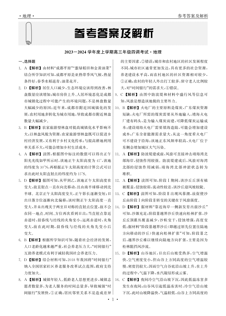 河北省衡水中学2024届高三上学期四调考试地理答案