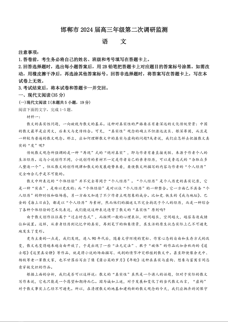 河北省邯郸市2024届高三上学期第二次调研监测语文