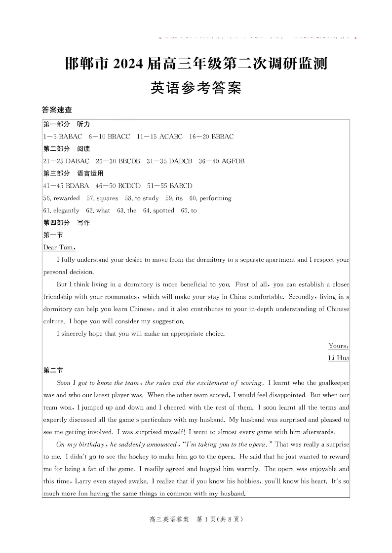 河北省邯郸市2024届高三上学期第二次调研监测英语答案