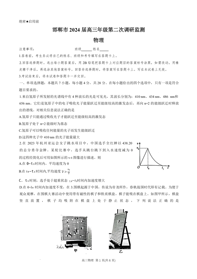 河北省邯郸市2024届高三上学期第二次调研监测物理