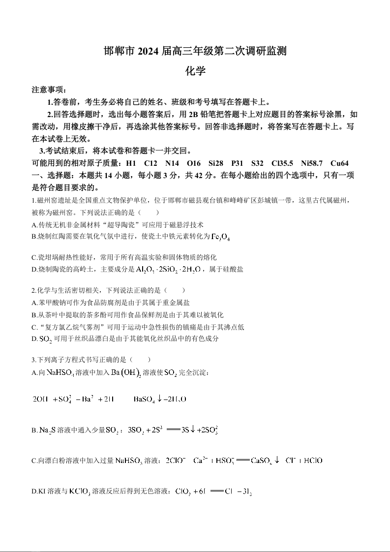 河北省邯郸市2024届高三上学期第二次调研监测化学+答案
