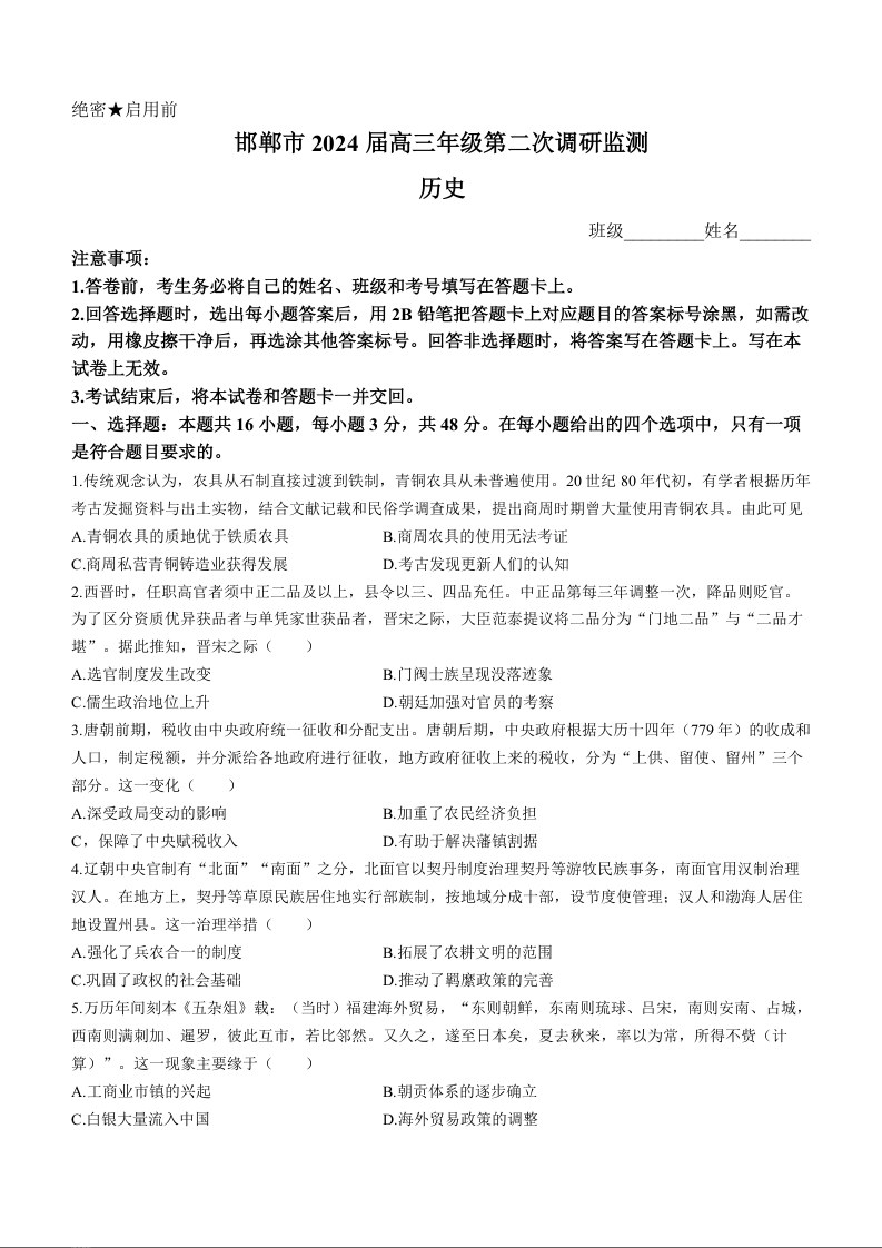 河北省邯郸市2024届高三上学期第二次调研监测历史