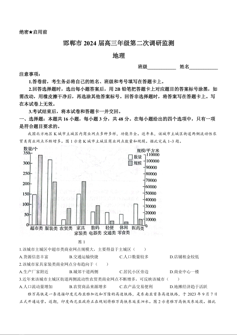 河北省邯郸市2024届高三上学期第二次调研监测地理