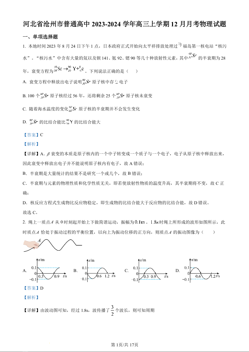 河北省沧州市2024届高三上学期12月月考物理(精品解析版)