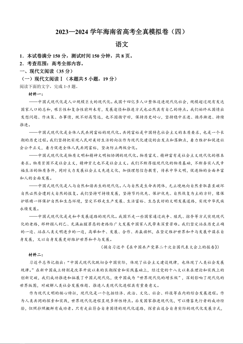 海南省2024届高三上学期高考全真模拟卷(四)语文+答案