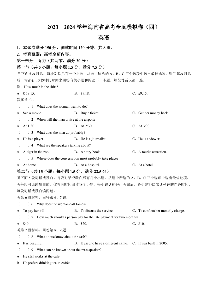 海南省2024届高三上学期高考全真模拟卷(四)英语+答案