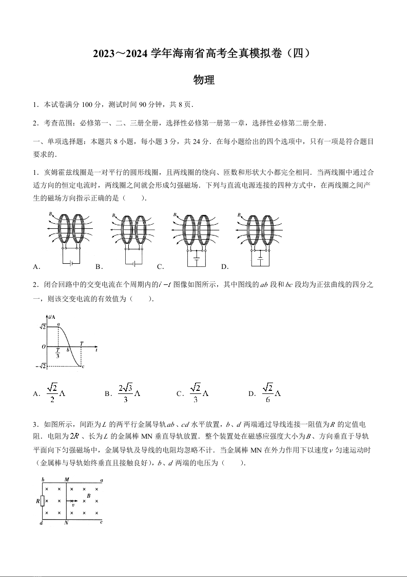 海南省2024届高三上学期高考全真模拟卷(四)物理+答案