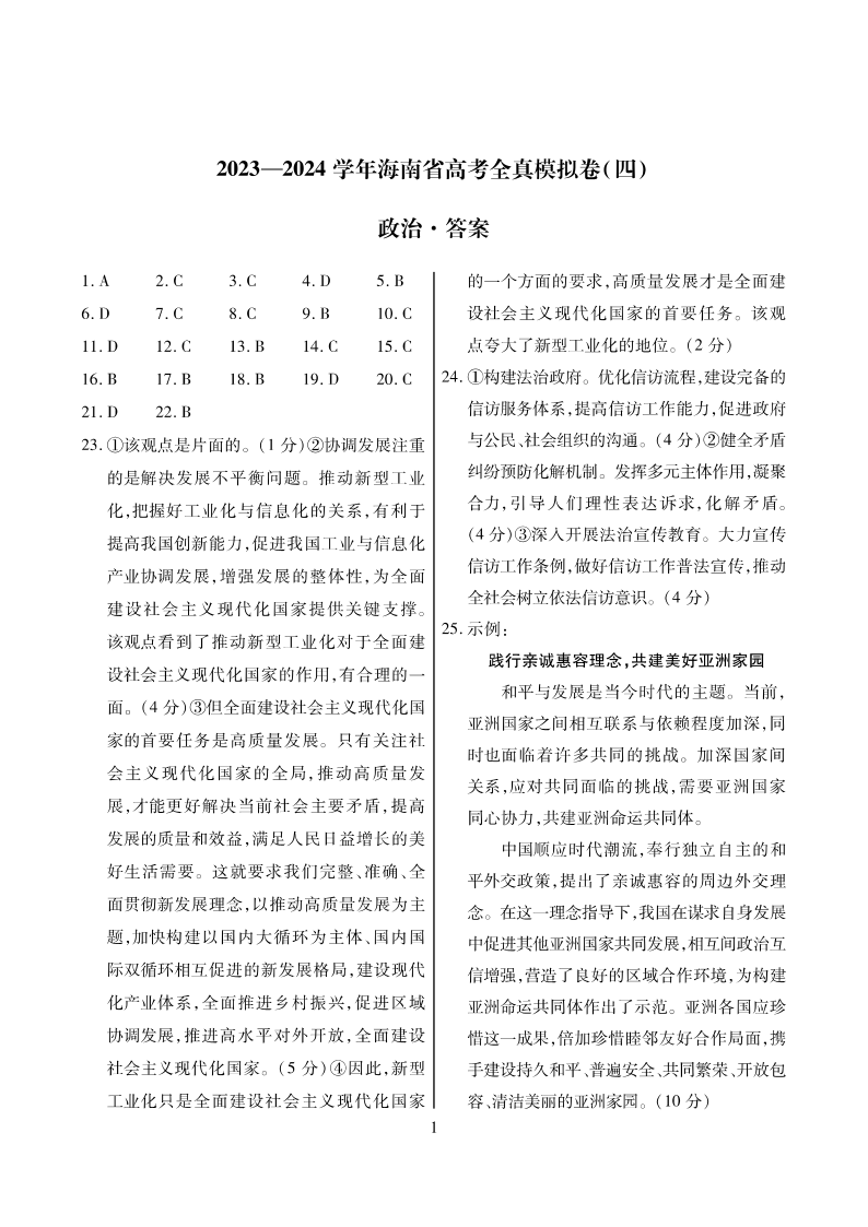 海南省2024届高三上学期高考全真模拟卷(四)政治答案