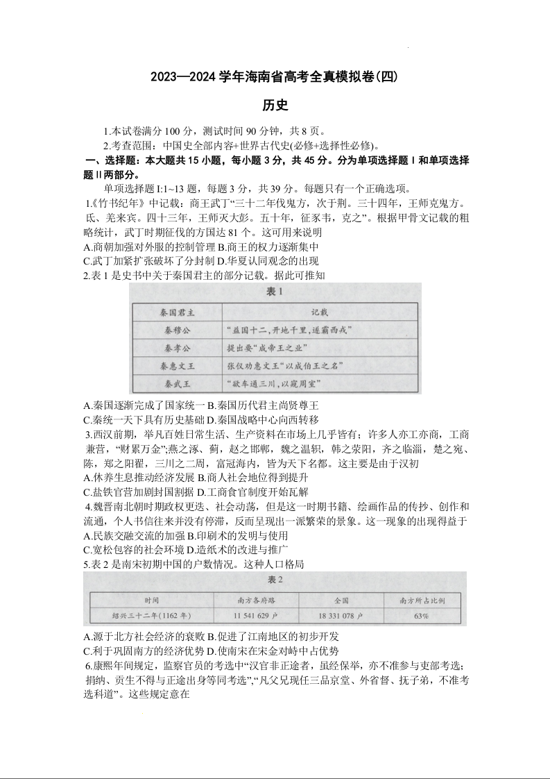 海南省2024届高三上学期高考全真模拟卷(四)历史+答案