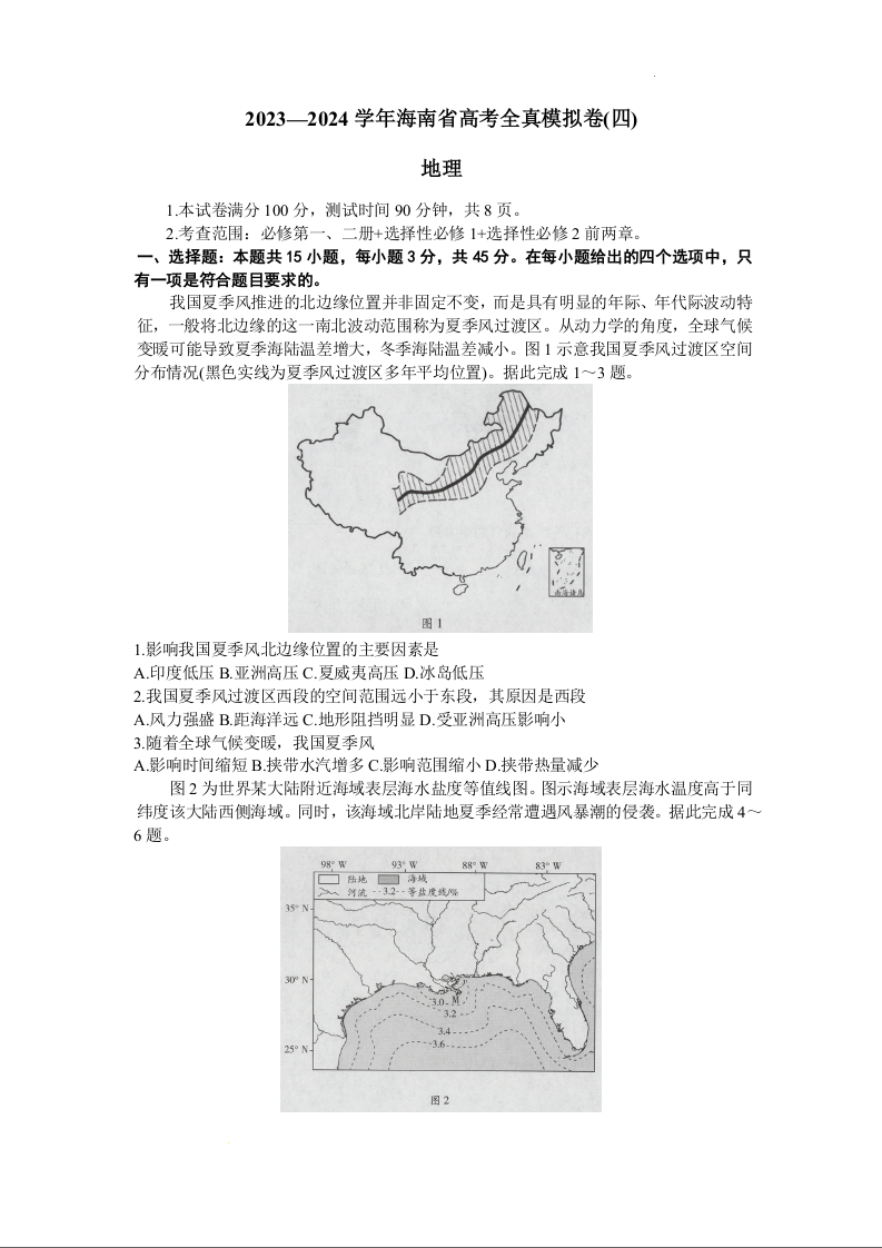 海南省2024届高三上学期高考全真模拟卷(四)地理+答案
