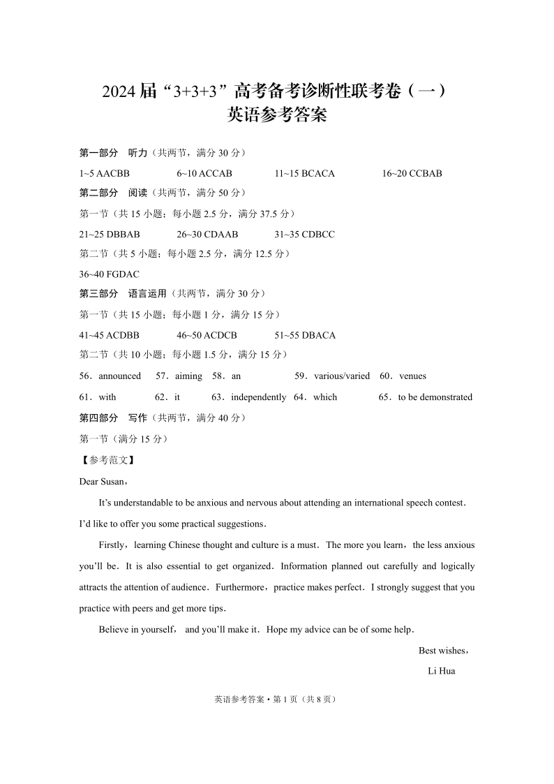 贵州省2024届“3+3+3”高考备考诊断性联考卷(一)英语答案