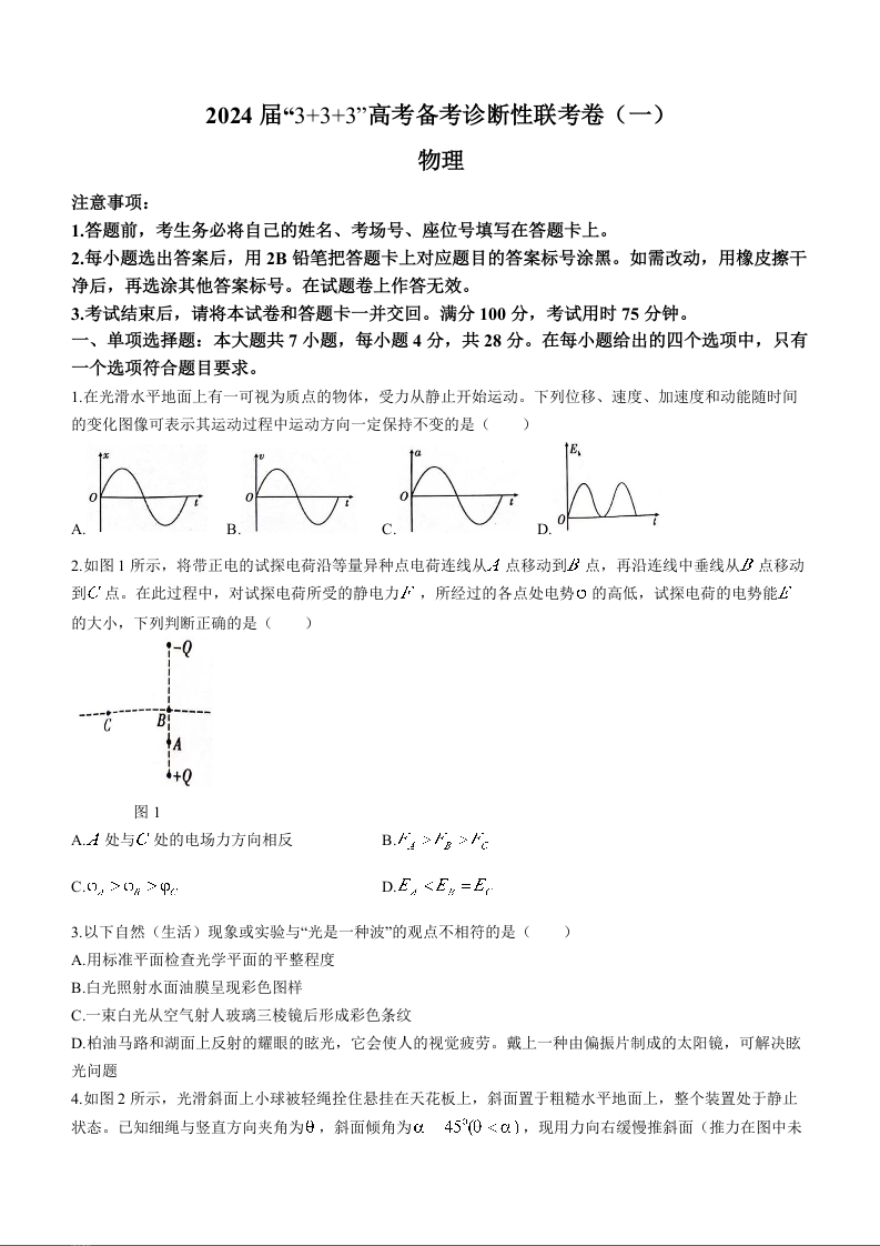 2024届贵州省“3+3+3”高考备考诊断性联考卷(一)物理