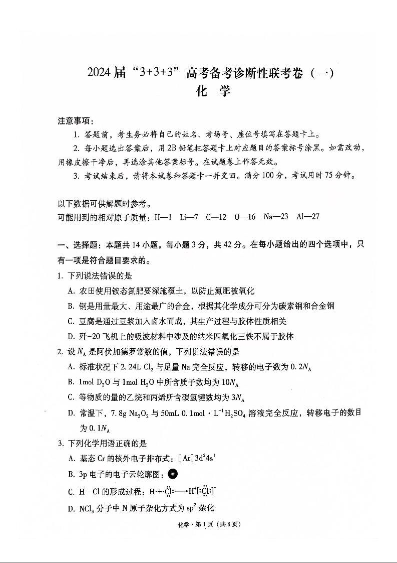 贵州省2024届“3+3+3”高考备考诊断性联考卷(一)化学
