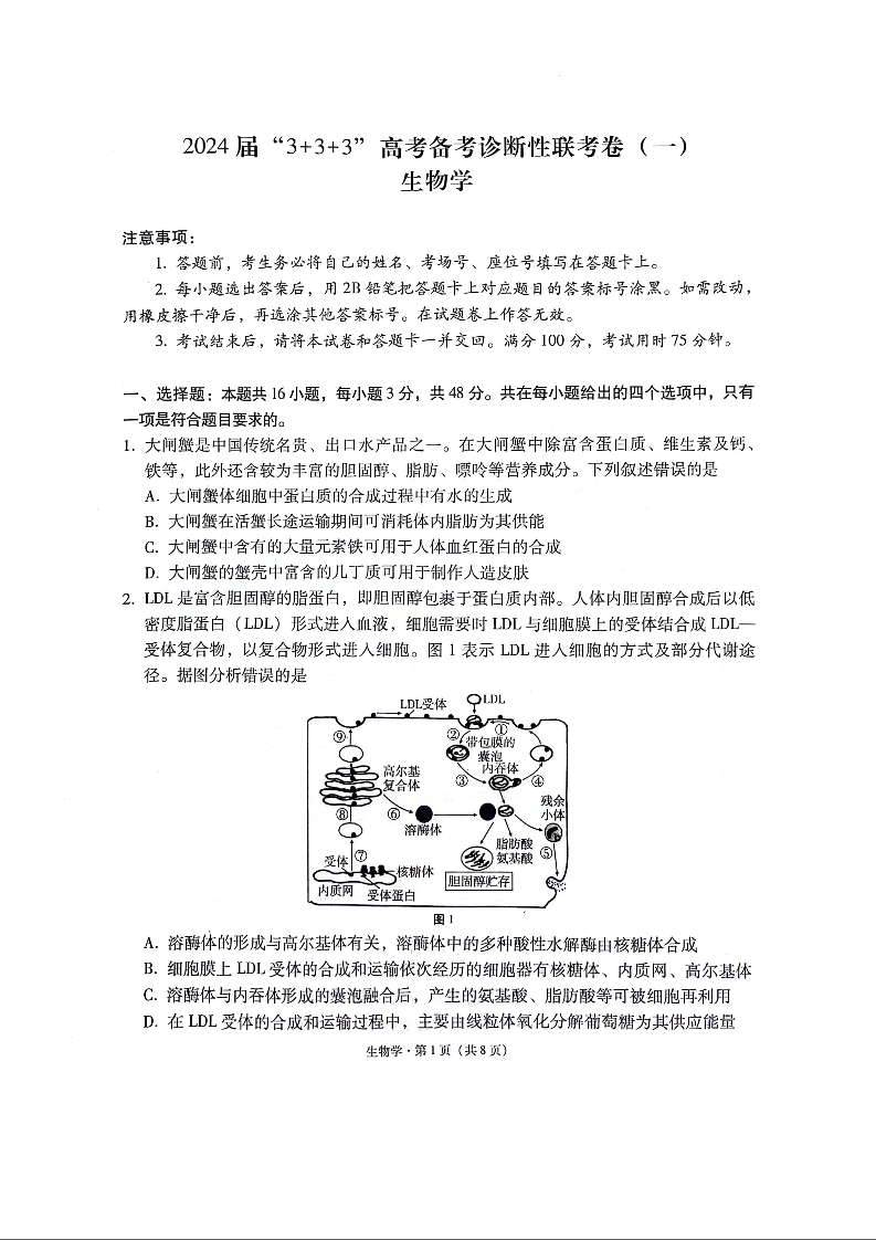贵州省2024届“3+3+3”高考备考诊断性联考卷(一)生物