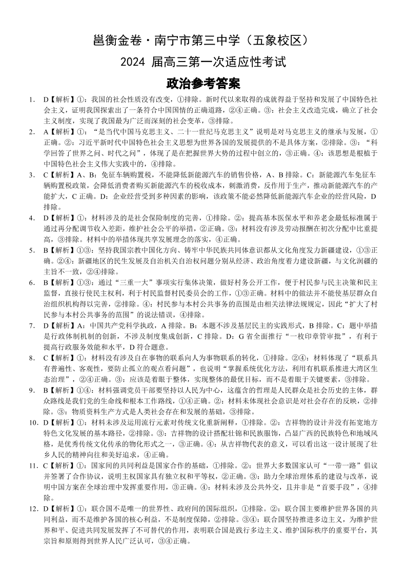 邕衡金卷·广西南宁市第三中学2024届高三第一次适应性考试(12月联考)政治答案
