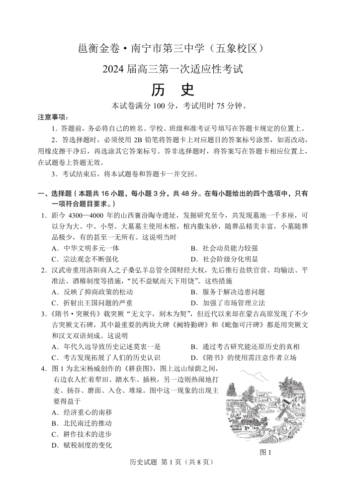 邕衡金卷·广西南宁市第三中学2024届高三第一次适应性考试(12月联考)历史