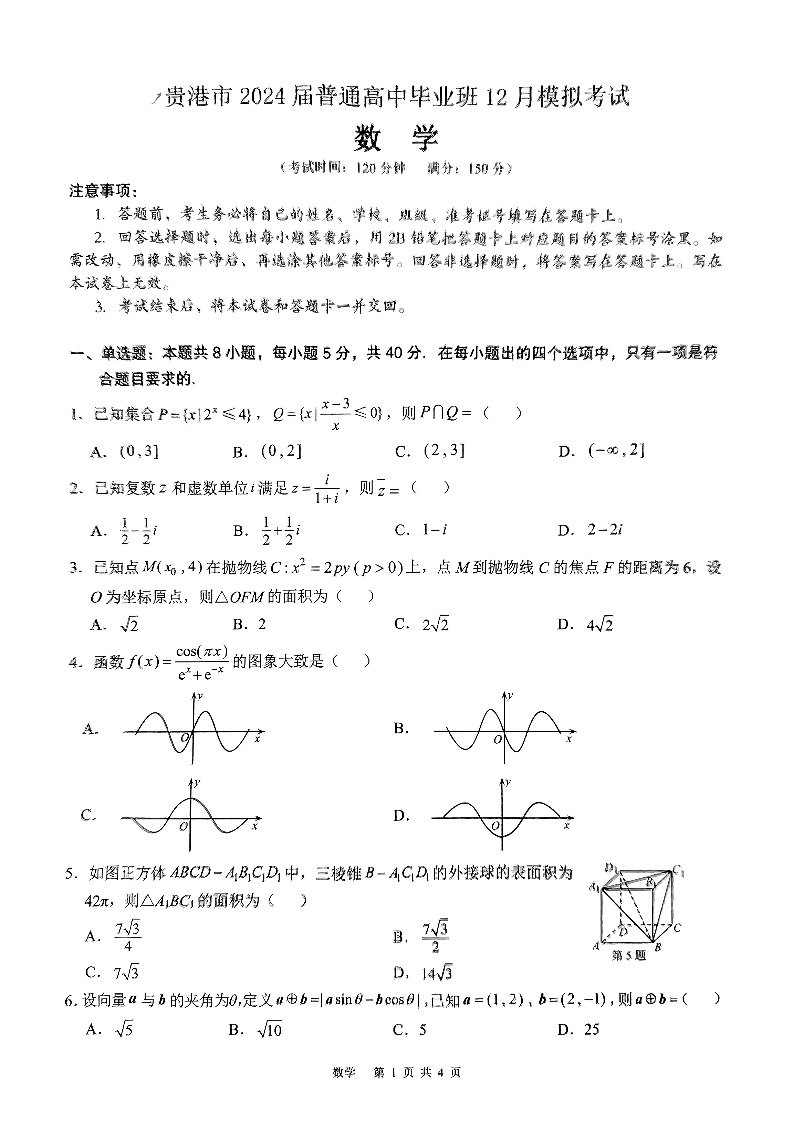 广西省贵港市2024届高三上学期12月模拟考试数学