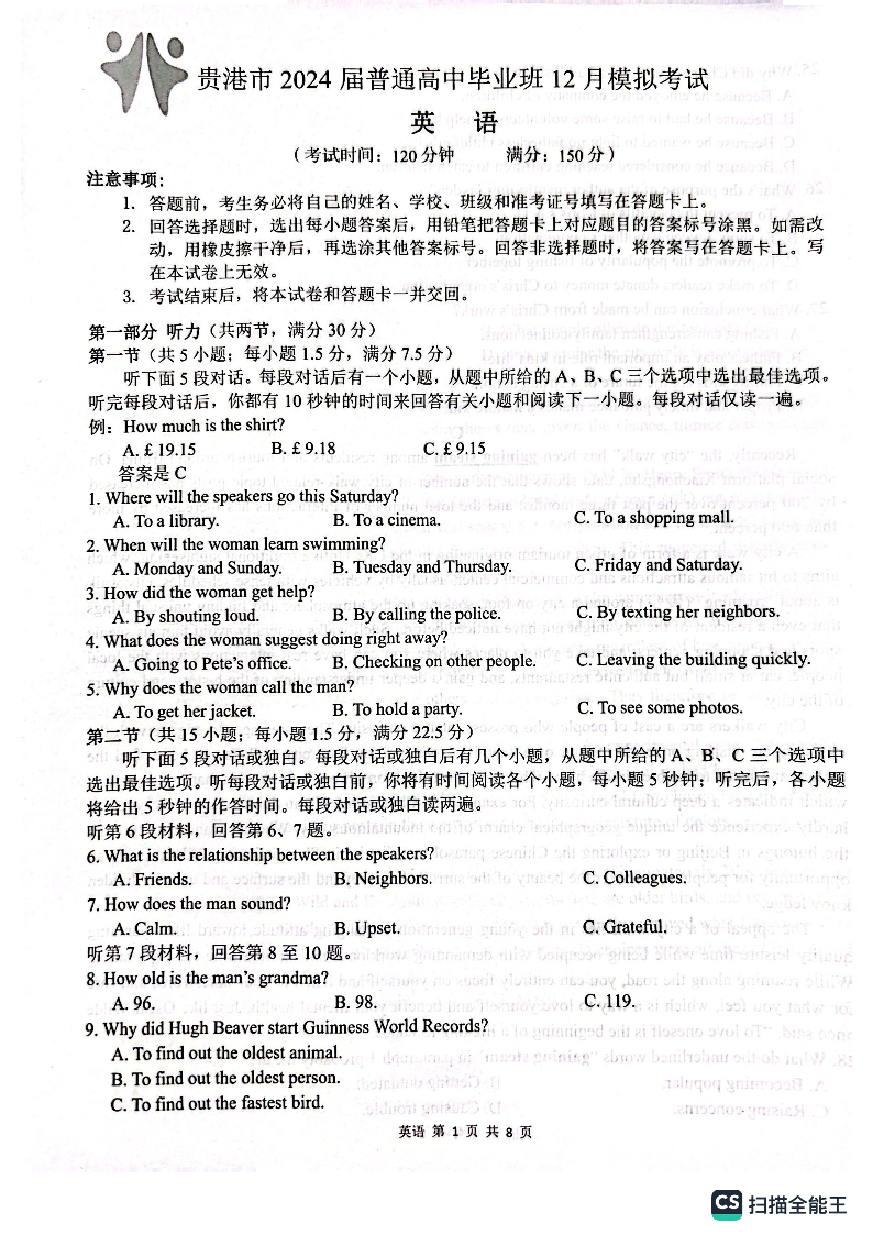 广西省贵港市2024届高三上学期12月模拟考试英语